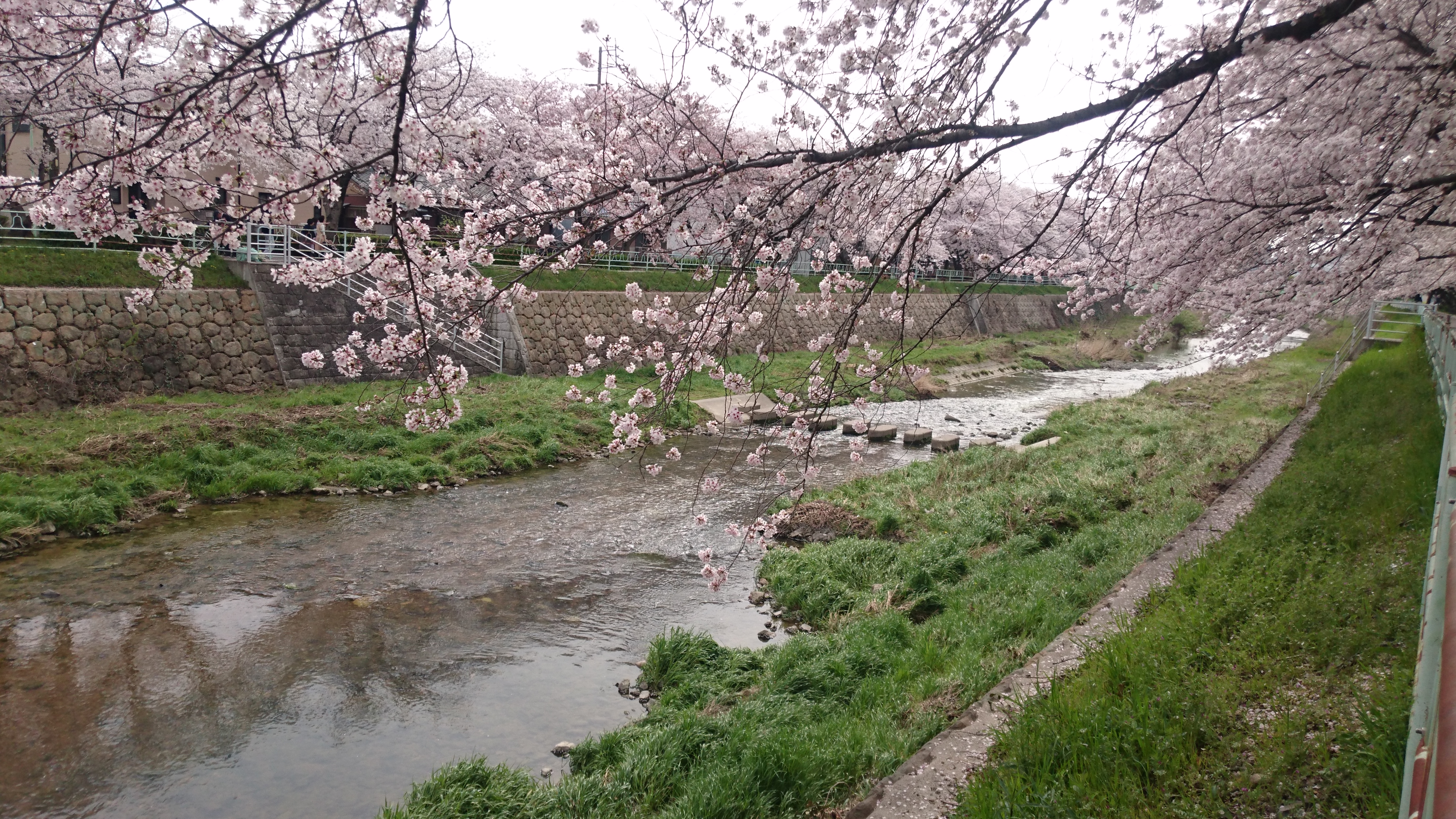 住宅街に穏やかに流れる香流川沿いの桜並木
