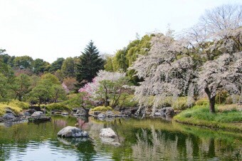 白鳥庭園の池に映える桜